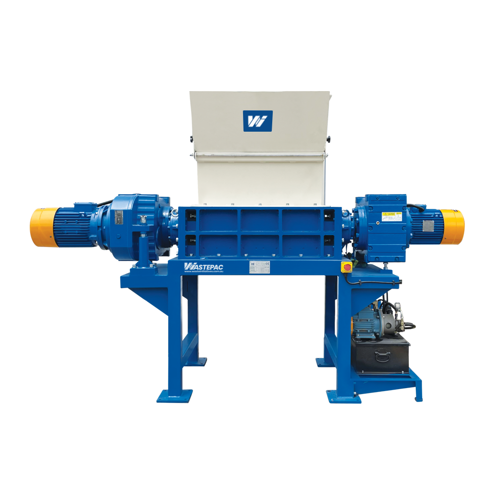 The Wastepac GL2180 is a low-speed dual shaft shredder for e-waste, tyres, plastics, and MSW. Features 20mm cutters and optional hydraulic drive.