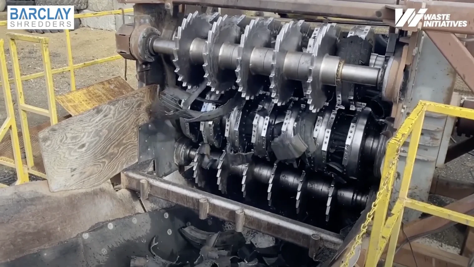 The Barclay Primary Tyre Shredder, a “workhorse” in tyre shredding equipment that processes tyres up to 72″, producing 4.9″–10″ (124–254 mm) strips in seconds. Built tough for high-volume operations.