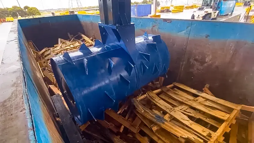 Roll packers use a rolling function to crush bulky waste materials such as timber pallets and crates within an open skip waste bin.