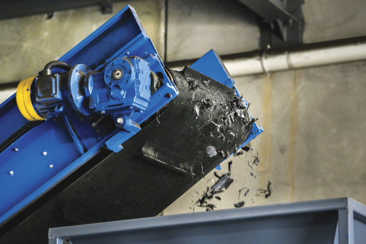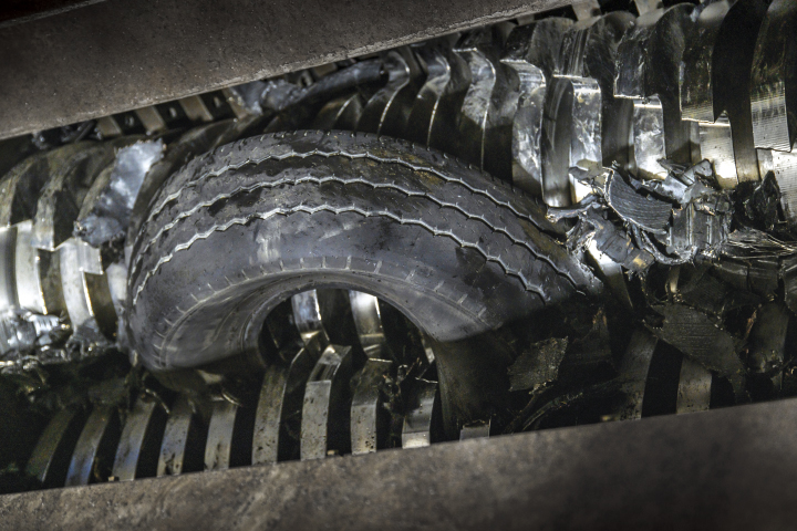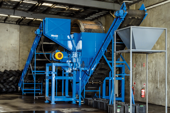 The result is a tyre shredder with an integrated rotary screen. The turnkey system includes infeed and outfeed conveyors, controlled by a main PLC control station. It’s been designed and engineered to take whole tyres down to 50mm chip and can process up to 550 tyres per hour.