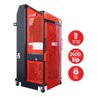 - Glass Bottle Breaking System – high-throughput WastePac Glass Crusher with interlocked Versatip bin tipper and drainage tray for liquid removal